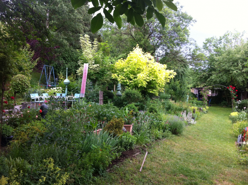 Eine Ulmer Rosenfreundin initiierte zum zweiten Mal einen „Tag des offenen Gartens“ in ihrer Gemeinde nahe der Teck (Obst- und Gartenbauverein Bissingen a.d.Teck / ogv-bissingen.de). Unterschiedlich geprägte Gärten waren zu sehen; drei besuchte Gärten (von insgesamt sechs) zeigten interessante Lösungen mit vorgegebener Fläche und mit altem Baumbestand persönliche Gartenempfindungen umzusetzen – Ausdruck eigener Lebensauffassungen der Gartengestalterinnen.