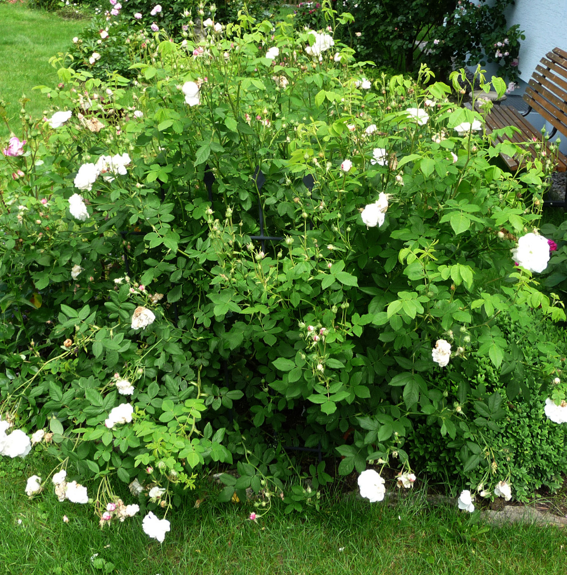 ie wächst breitbuschig, leicht überhängend. Sie wird gut 2 m hoch. Zieht man sie als Kletterrose, kann sie bis zu 4 m erreichen. Ihre Triebe sind stachellos und biegsam. Sie gibt sich mit wenig Pflege zufrieden. Ich hatte sie zwischen zwei Beersträucher platziert, dadurch hatte sie Halt bekommen; auch Ausläufer kann sie machen. In ihrem Umfeld duftete der Garten traumhaft.